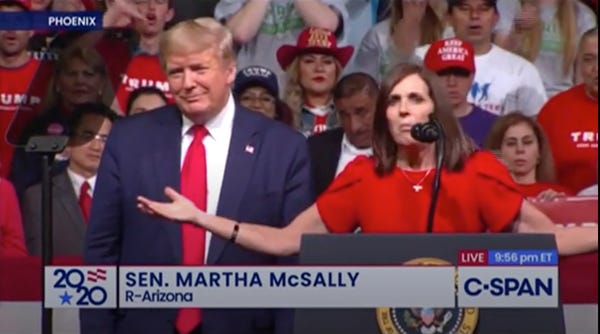 Trump's opening act was Arizona Sen. Martha McSally, whose remarks were a tiresome word salad filled with partisan rancor and sycophantic fealty to the president. She couldn't say enough good things about Trump, which is why she was invited. McSally called the reporters present "liberal hacks," because that's her hot "where's the beef?" catchphrase.