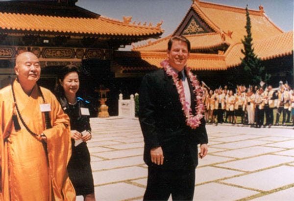 For comparison purposes, though, it's useful to remember that time back in 1996 when the Buddhist Temple Fundraising Scandal momentarily had everybody mad at Al Gore, but then Bill Clinton got a blowjob and that was way more interesting than fundraising could ever possibly be, scandal-wise. But it was a pretty big friggin' deal, with straw donors going to prison, Buddhist nuns admitting they'd been given money to pass on to the Clinton/Gore reelection campaign, and virtually nobody believing Al Gore's insistence that he didn't realize he was at a fundraiser, largely because that was pretty hard to believe.