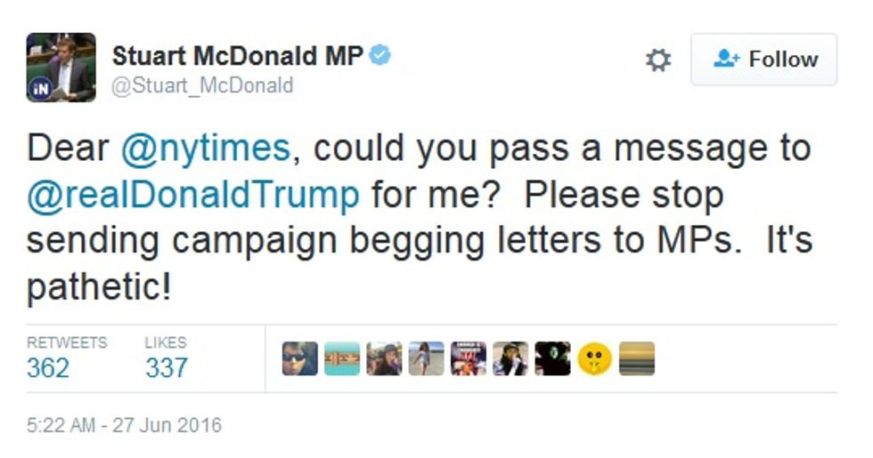 Then other members of the Scottish parliament started saying they'd gotten fundraising emails from the Trump campaign, too. We have to say, we like Scottish tweeters!