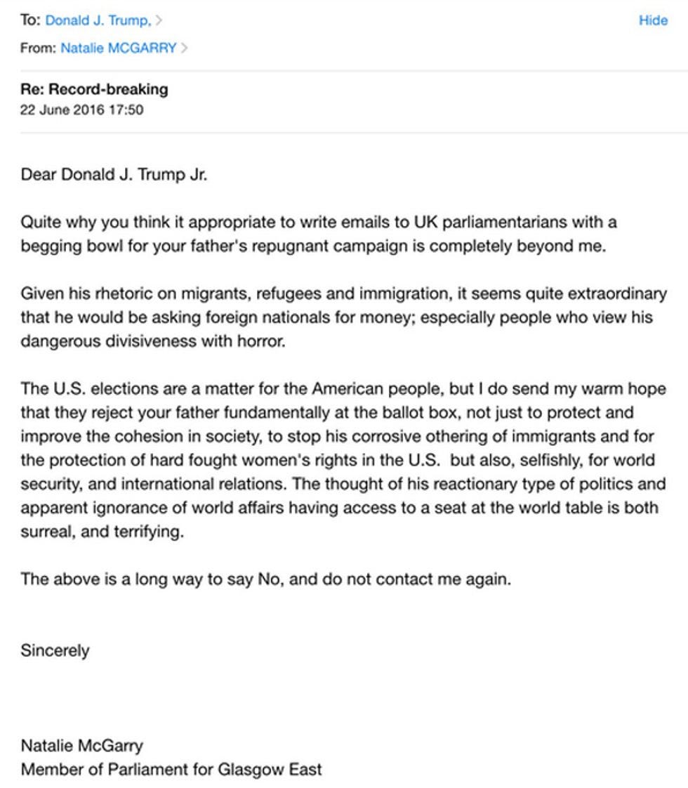 Oh look, there goes Donald Trump's campaign acting like complete morans again! Over the past couple days, the Trumpers have sent desperate fundraising emails to members of several foreign parliaments, who not only don't care for having their inboxes spammed but really don't like being spammed by an American politician to whom it would be illegal for them to actually send a donation. The stories started when Scottish MP Natalie McGarry complained on Twitter about solicitations sent under the name of Trump's son, Donald Jr., asking her to please please please help his dad stop "Crooked Hillary." McGarry was Not Amused: