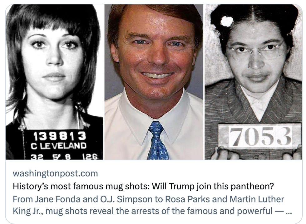 The Washington Post joined the discussion Monday with an article titled, "History’s most famous mug shots: Will Trump join this pantheon?" A "pantheon" usually refers to a group of particularly respected, famous, or important people. Trump got busted for especially scuzzy business fraud. He's not Zeus, unless you count the sexual assault accusations.