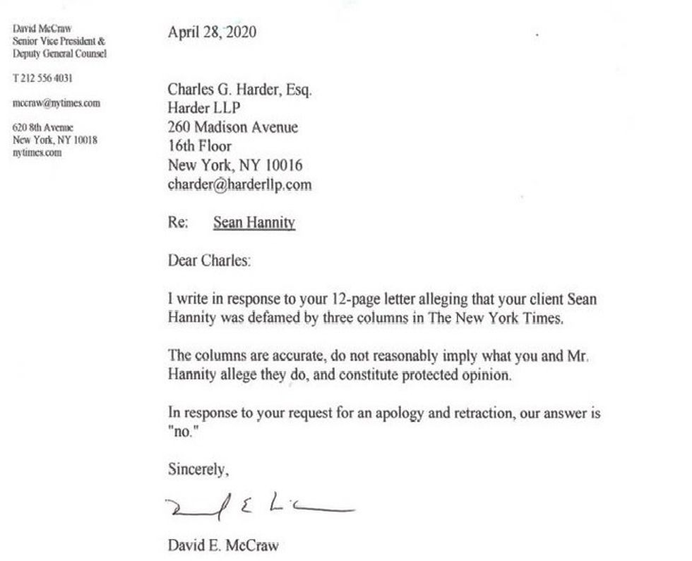 America, Sean Hannity has HAD ENOUGH of the dishonest media's unfair treatment of him. So he hired a lawyer, the famous Gawker-destroying Charles Harder, to send a nastygram warning the New York Times it had better retract three opinion pieces that supposedly defamed Hannity by opining that he had downplayed the seriousness of the COVID-19 pandemic. And if they didn't retract? Consequences would never be the same. The 12-page letter accused columnists Ginia Bellafante, Ben Smith, and Kara Swisher of all sorts of horrible libelslanders, saying the columns were part of an "ongoing campaign to personally attack Mr. Hannity by mischaracterizing and making false statements with respect to his coverage of the coronavirus pandemic."