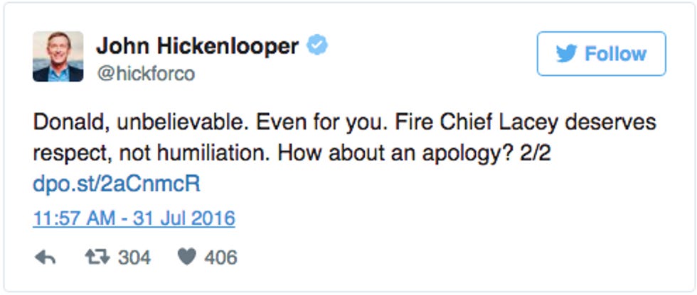Colorado Governor John Hickenlooper criticized Trump for going after Lacey in a tweet, and demanded an apology: