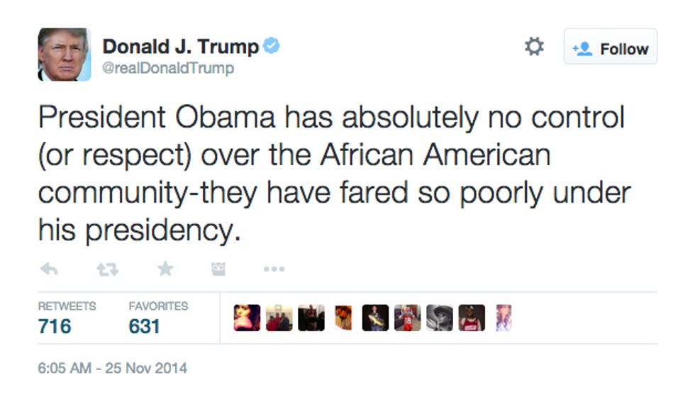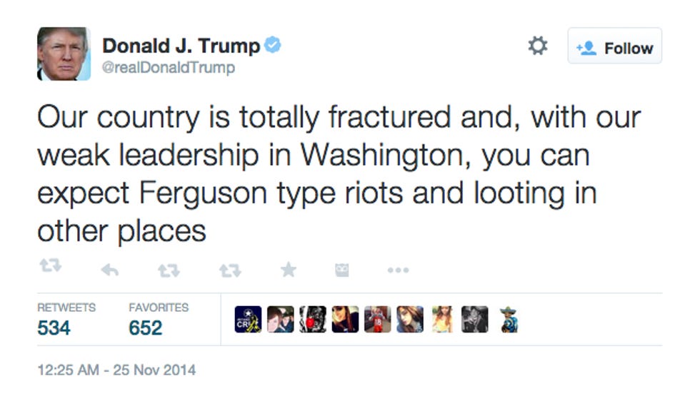 Like most of the country (except for those hypothetical people who were quite disappointed that "Dancing With The Stars" was preempted), Trump was glued to his gold-plated Lazy Boy to see whether the grand jury would indict Officer Darren Wilson for killingunarmed teenager mutant supervillain Mike Brown. And he took to the internet -- thankfully, despite the president's attempted "power grab," Trump can still do that -- to share his thoughts, which of course we have all been dying to know. At the risk of stating the obvious, the real lesson from Ferguson is how this is pretty much all Obama's fault.