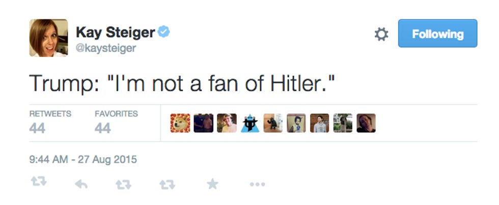 So really, the only voting demographic left for Trump to conquer is The Jooz, and what better way to make them swoon than to come out strongly against Hitler? Sure, Trump may keep a collection of Hitler's Greatest Hits next to his bed, but he got that from one of his Jew friends (who is not Jewish), so it's OK: