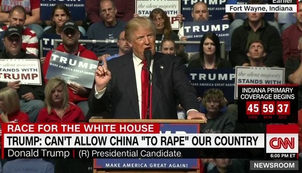 At a campaign rally in Fort Wayne, Indiana, on Sunday, Donald Trump forcefully described China's trade relationship with the USA as an act of sexual violence: