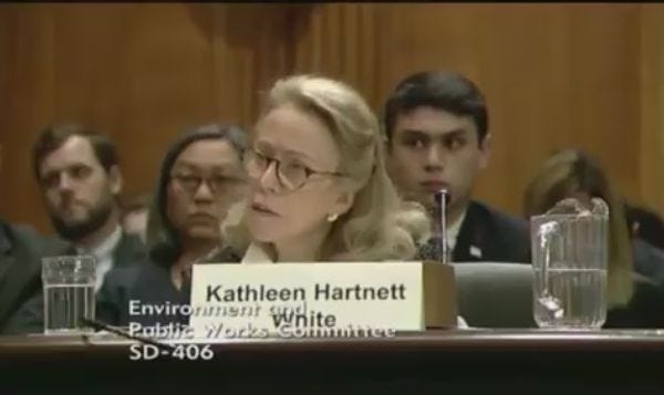 But Ms. Hartnett White was spectacularly unqualified, even for a Trumper -- in fact, she was anti-qualified. While she had served as the head of the Texas Commission on Environmental Quality (TCEQ), it must be noted that in Texas, that job mostly involved nodding and smiling while approving anything Big Oil, Big Ag, and Big Chemical wanted to do. As a cattle ranch owner and dog breeder, Hartnett White was certainly ready for that job, but over the years, she'd become a bit too vocally idiotic in her climate change denial to win confirmation by the Senate. She co-authored a 2016 book titled Fueling Freedom: Exposing the Mad War on Energy, which argued that fossil fuels were as essential to making America great as God, Guts, and Guns, and argues that the science is still not in on whether emissions of carbon dioxide cause global warming (no, the science is not out. Really). Her carbon-pimping also tended to be embarrassingly easy to mock: