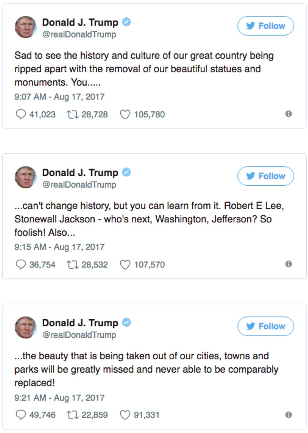 Donald Trump hasn't taken up the cause of slavery. YET. But he is very sad that those dedicated young Civil War buffs in Virginia won't be able to take their evening history lessons as the soft glow of torchlight illuminates the great General Lee's likeness.