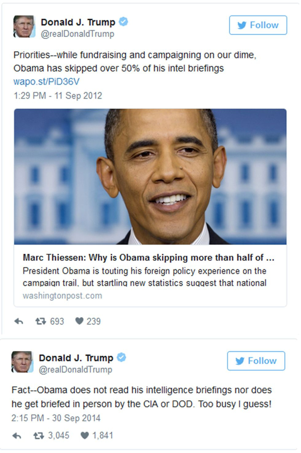 The situation is especially ironic given Trump's past criticism of Barack Obama when he falsely believed, without evidence, that the president was missing these same briefings.