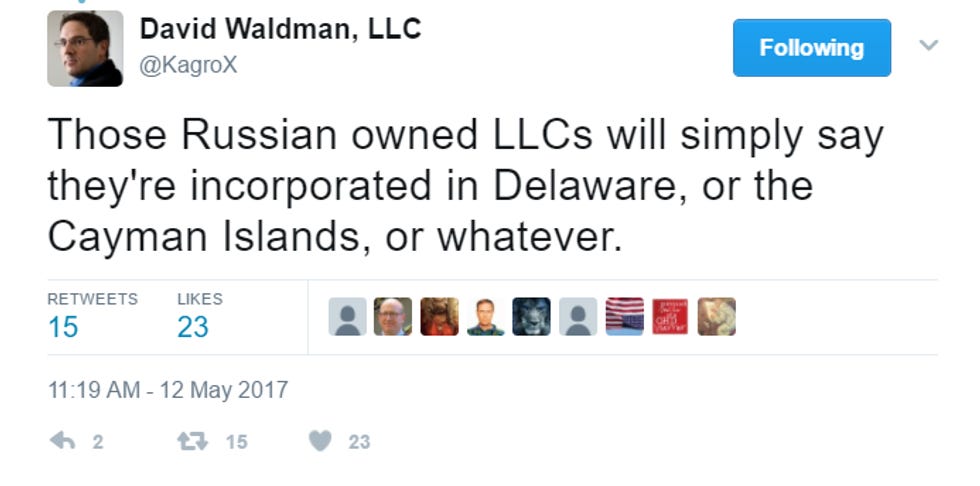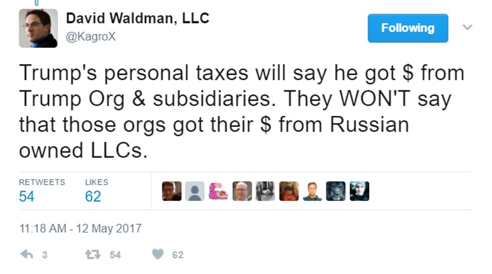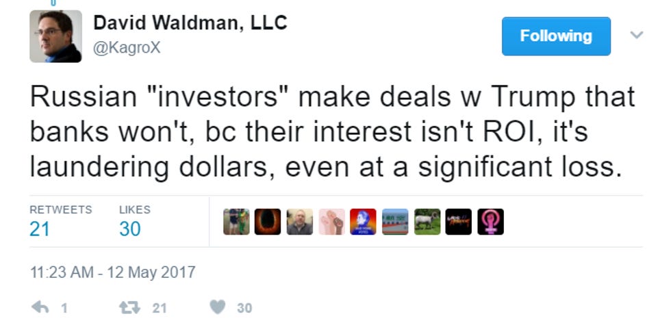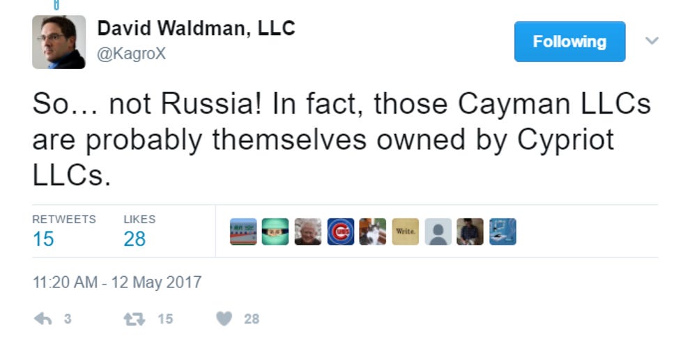 The Daily Kos's David Waldman has been LOL-tweeting about this since it came out, making salient points about how Donald Trump's sons have very clearly said on multiple occasions that the bulk of the Trump Organization's money has come from Russia, how Russian mobsters are most likely behind a lot of those LLCs, and other sexxxy stuff like that. Here is a sample:
