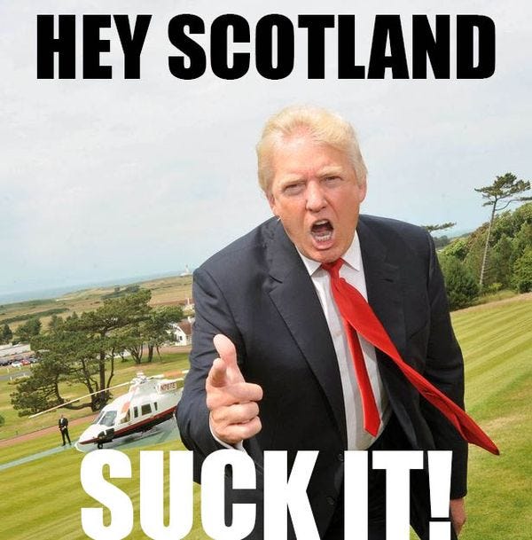 In all fairness, most of the Scots hate Trump not because of his inability to understand that the United Kingdom is a collection of several independent countries that were colonized and oppressed by the British for so long that they eventually said, "Fuck it," but because he purposefully meddles in local affairs. His previous golf course in Aberdeen has cut off a farm belonging to " Top Scot " Michael Foley, whose efforts to thwart the resorts incursion on his land have gone on for almost a decade, prompting Foley to raise a Mexican flag next to the course.