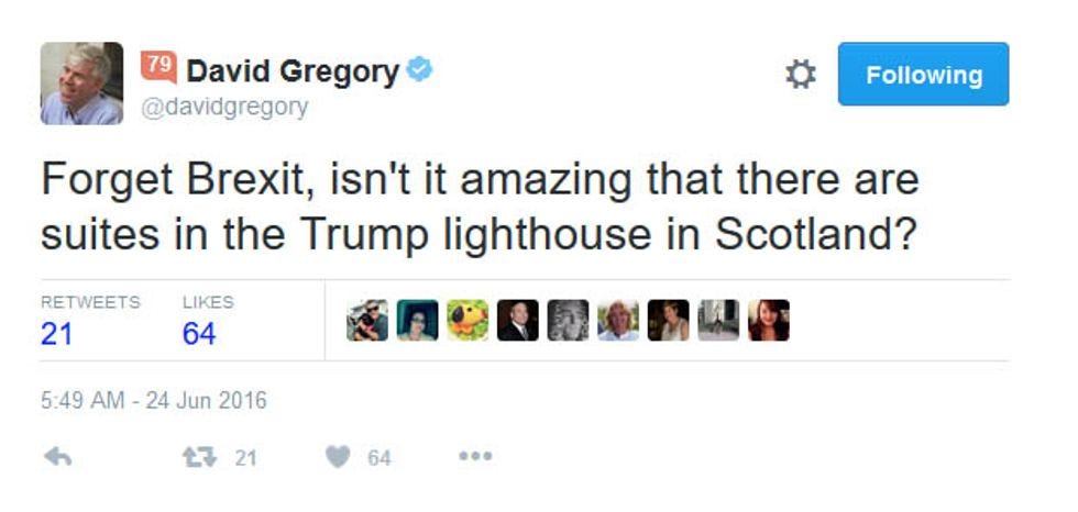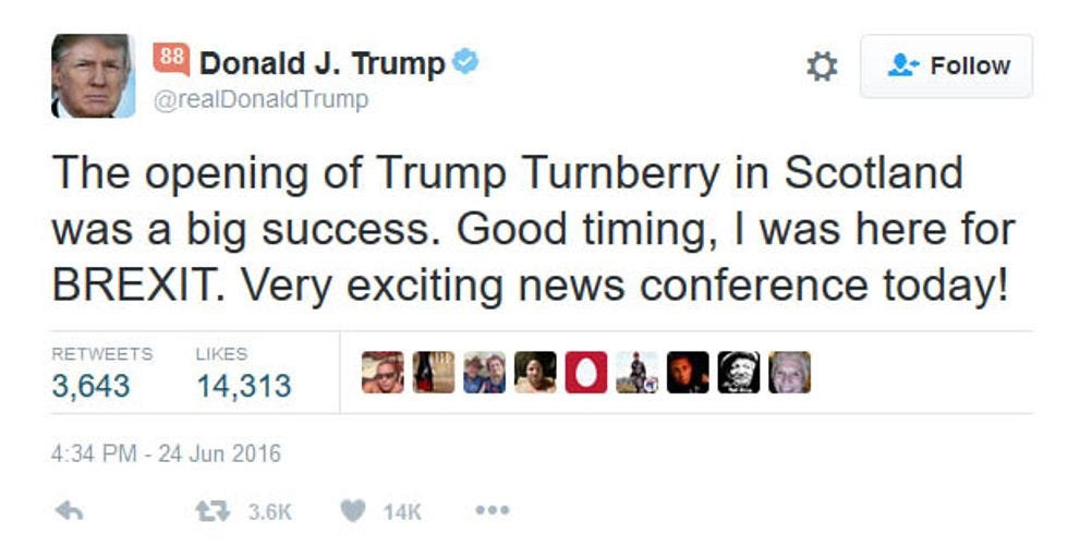 While the United Kingdom was busy losing its goddamn mind Friday, Donald Trump took the time to remind everyone that the the fall of the British Empire was only the beginning of the end of the modern world. As the results of the Brexit destroyed the British Pound and sent financial markets around the world into a free fall, Trump was slapping his baby dick across the face of the international press corps in Scotland. Instead of addressing the collapsing markets, he spent about 20 minutes giving a rambling infomercial for his next huge embarrassing failure, another golf resort.