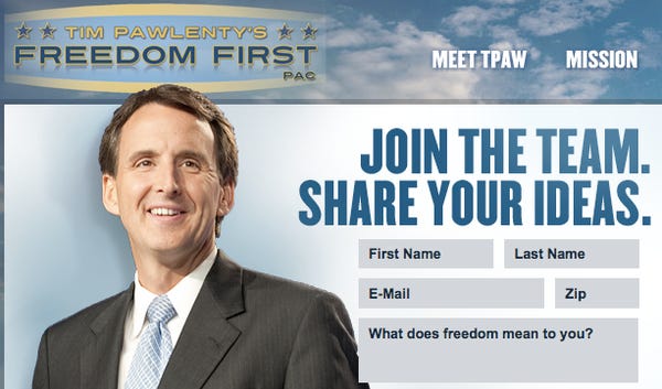 Have you checked out TimPawlenty.com today yet? Oh, please do! Minnesota Governor Tim Pawlenty, who self-identifies as TPAW, has made up some new thing called "Tim Pawlenty's Freedom First PAC." It sounds like a mid-range BBQ place on a highway somewhere, but it is not! It is, according to TPAW, an "organization dedicated to putting freedom first again in America. By helping candidates and translating our ideas into policies that everyone can relate to and support, we can turn back the growth of Washington and renew the promise of freedom." As you can see, this is markedly, markedly worse than a BBQ place.