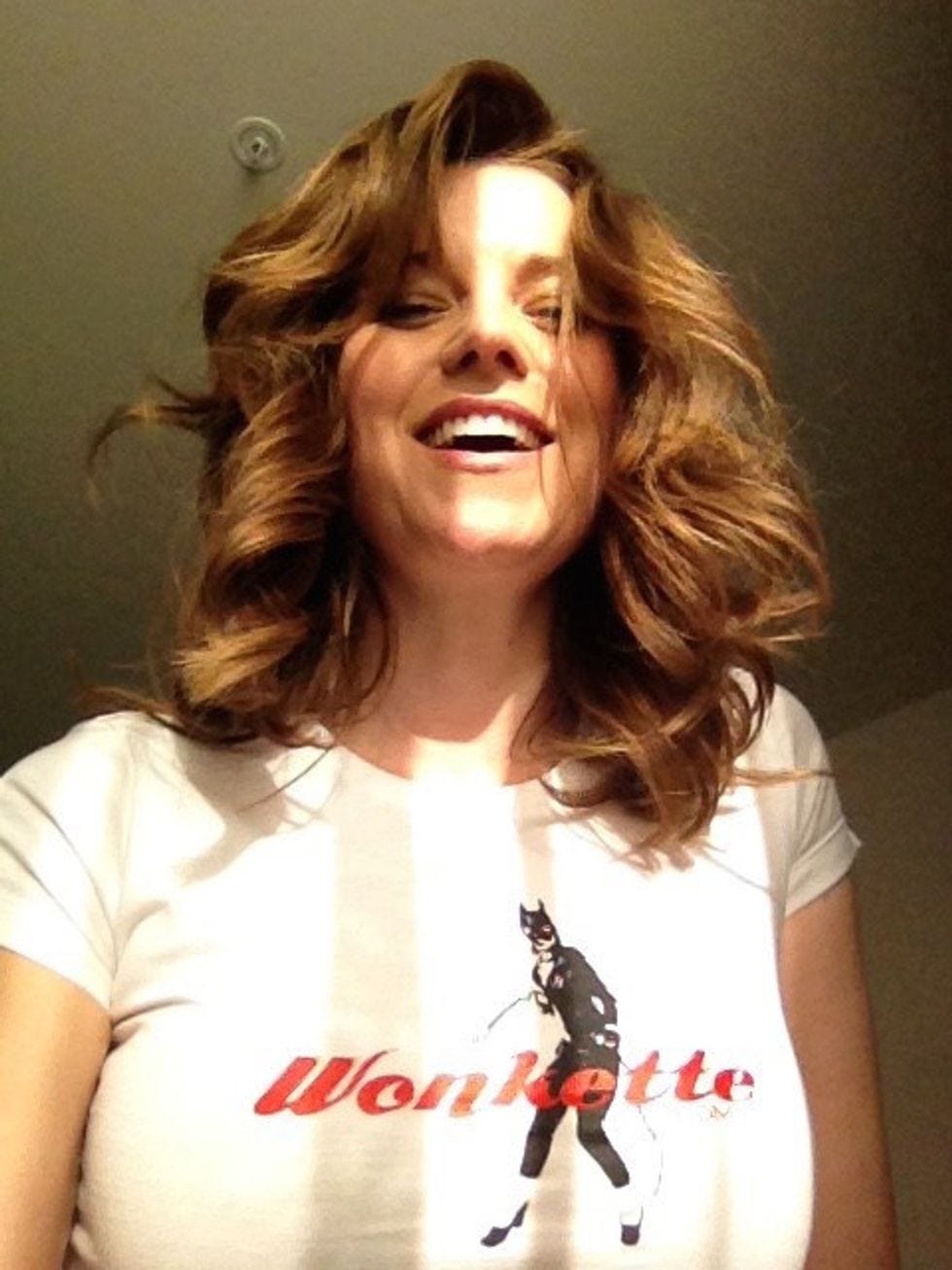We got men's shirts, and women's shirts, and panties and a mug (see above!) and refrigerator magnets and stickers (they are tinier than we thought so we're not charging hardly anything for em), and we could put her on an apron if you want her on an apron! (We can put anything on an apron, WE GOT APRONS SHAN. I figure they'll be $19.99, with free shipping, and if you want something ELSE on an apron, email rebecca at wonkette dot com!)