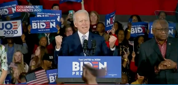 BIDEN: For all those of you who've been knocked down. Counted out. Left behind. This is your campaign. Just days ago, the press and the pundits declared this candidacy dead. Now, thanks to all of you, the heart of the Democratic Party, we just won, and we've won big because of you. And we are very much alive.