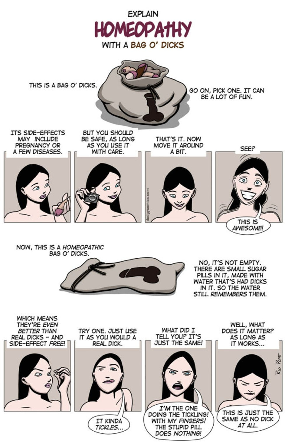 Our final story is less a story and more the best thing a friend of the bulletin ever sent us. Comic writer Ruy Platt decided to explain the ridiculousness of homeopathy to the masses using a Wonkette-favorite metaphor of a big ole bag of dicks, and lest we Buzzfeed ourselves, it's pretty perfect. Sources could not confirm if the dicks were of the rat variety or if they'd been lightly salted with poison.