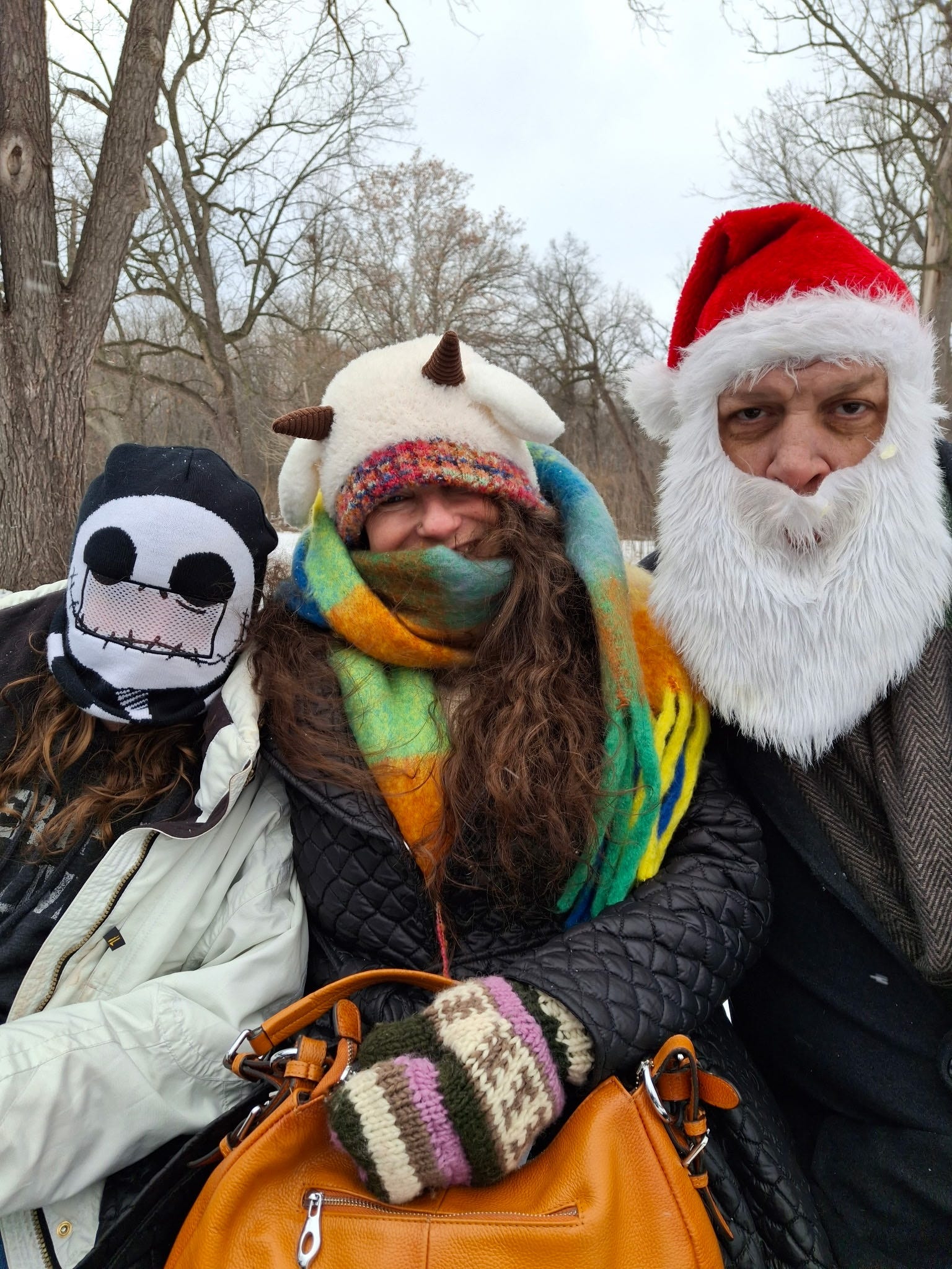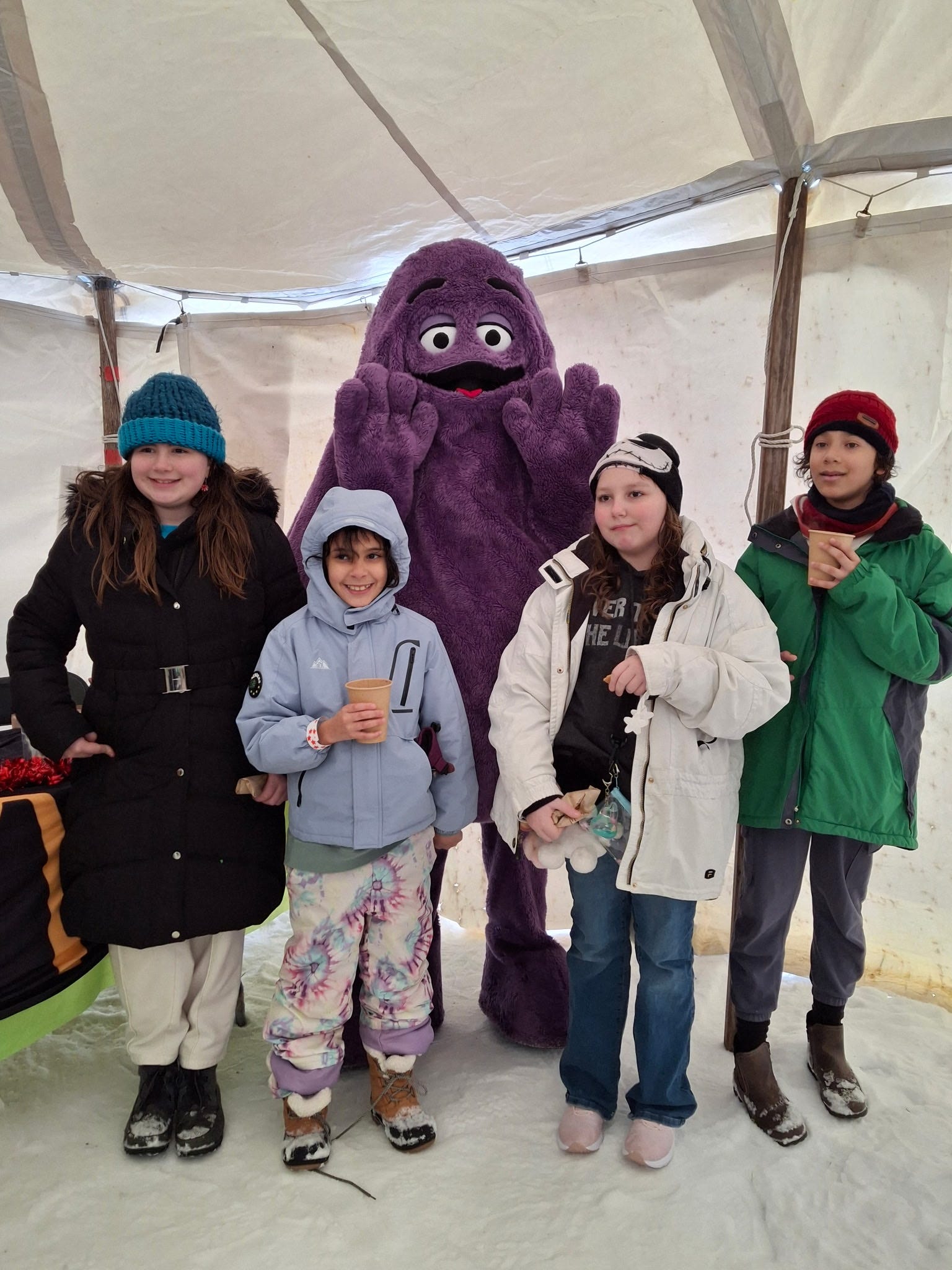 Haha, we went to a wonderful Christmas/Hannukah/Kwanzaa ecumenicism at Detroit’s Palmer Park log house and saw Grimace! That’s our friend Chloe, granddaughter Lu, daughter Donna, and nephew Dzho. Detroit always has tons of free events for kids and they always give you presents for showing up!