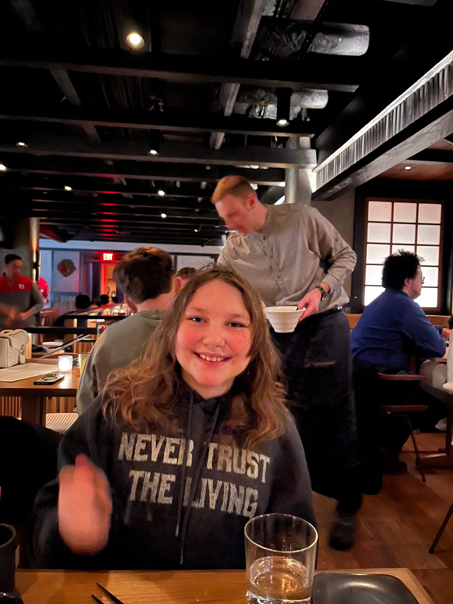 Donna and I had a wonderful date. Look behind her. (It’s not really Tim Robinson but it looked SO MUCH LIKE HIM and I kept trying to creepshot him ALL NIGHT and then I sent this, the least blurry of the photos, to Shy and just said “Look behind her” and he replied WHAT THE HELL IS HE DOING WAITING TABLES, so I’m not crazy.) But also her shirt is so rad. I love my goth tween.