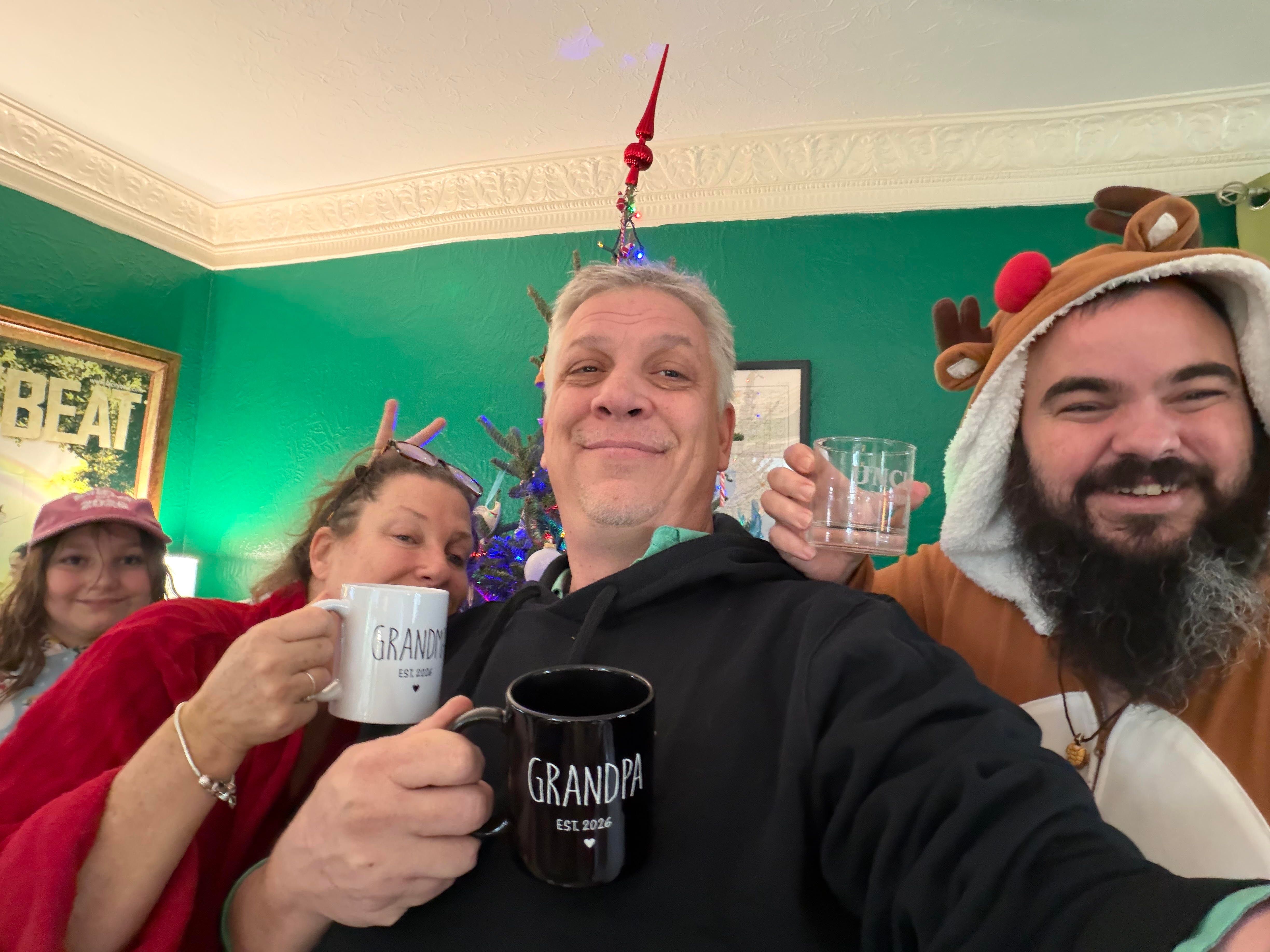 What cups are Shy and I holding on Christmas morning? Donna’s hat says “aunt” and good son Jimmy’s rocks glass says “uncle.” What on earth could my good stepson Keifer and his love Sydney be telling us? Look at that happy fucking husband.