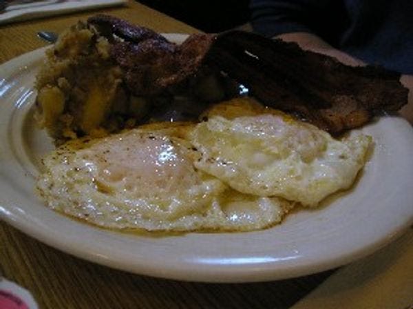 The food's a bit of a mixed bag, but fortunately, none of it costs very much. Pluses: the enormous, light and airy hotcakes and the eggs, which aren't overcooked. Minuses: the bacon (dry) and the homefries (mushy); both had probably been sitting around for too long. Tossup: the grits, which were substantive and flavorful, but which cameswimmingin butter.