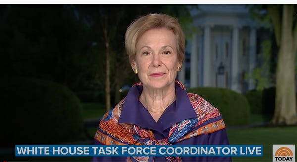 Dr. Birx doesn't have a lot of credibility left anyway. Dr. Birx reportedly told the coronavirus task force on April 11 that the "nation was in good shape." We were far from "in good shape."