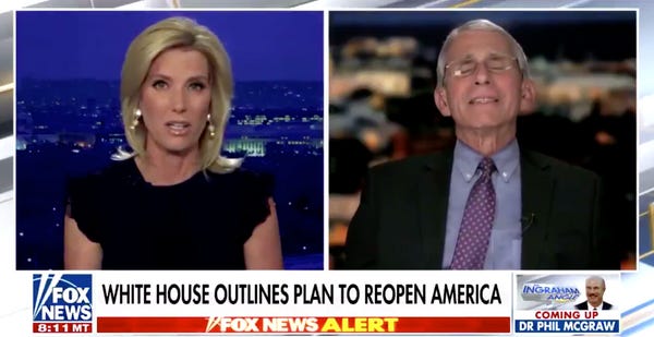 Dr. Anthony Fauci is a true patriot. He cares enough about public health that he doesn't just put up with Donald Trump on a daily basis but he also went on Laura Ingraham's white power hour Thursday and offered real-live facts to her viewers. Ingraham has slimed Dr. Fauci a lot on Twitter because all his fancy science talk gets on her nerves. She was a little nicer to his socially distant face and tried to get him to denounce Democrats who criticized Trump's mismanagement of the COVID-19 crisis.