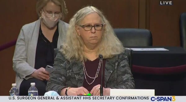 During her Senate confirmation hearing, GOP Senator Rand Paul shouted transphobic garbage at her for a while, because that's the sort of thing he does when he's not spreading disinformation about Covid-19. Dr. Levine responded to his rants with science and logic, which is like Kryptonite to a Republican.