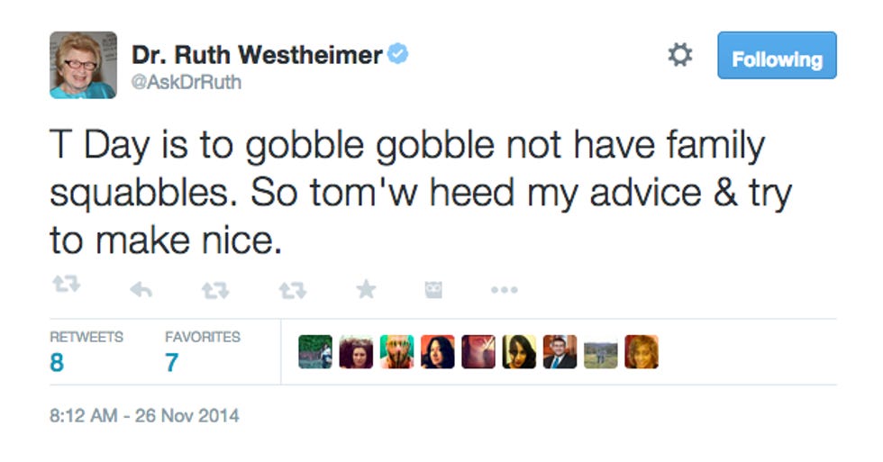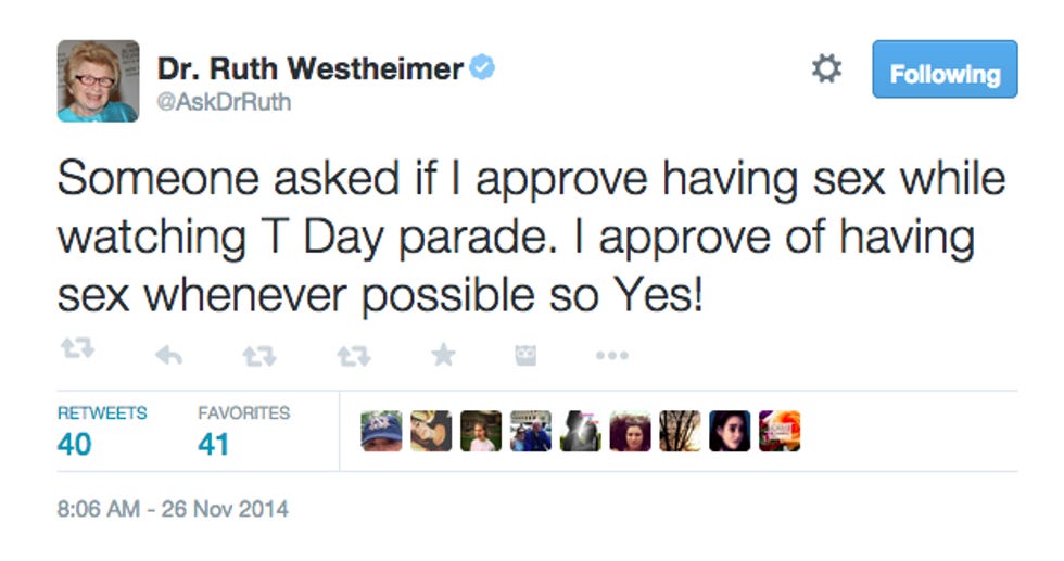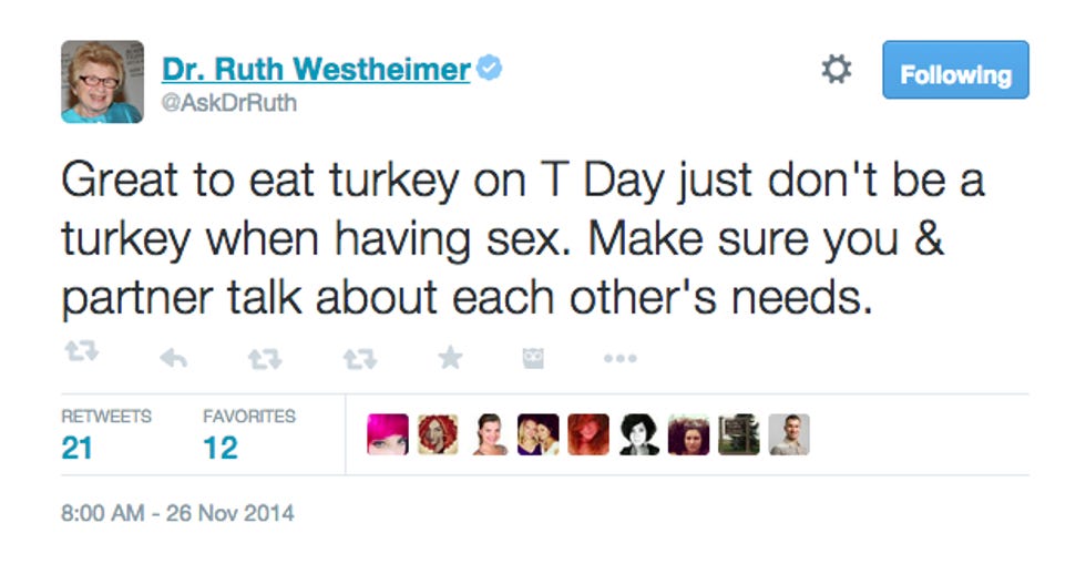 You know what goes great with Thanksgiving? Sex! Here's our national treasure, Dr. Ruth Westheimer, with some helpful sexxytime tips for how to do Thanksgiving sex on Thanksgiving.