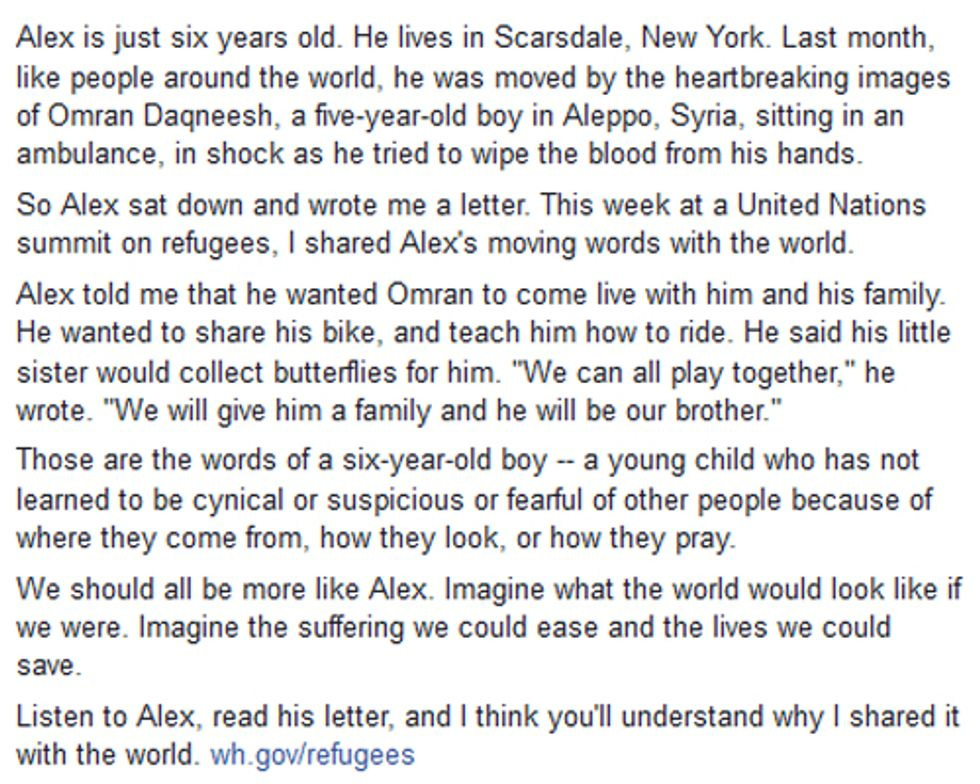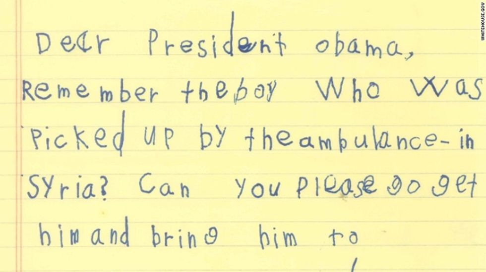 Then there's six-year-old Alex from New York, who wrote a letter to the president after seeing a photo of Omran Daqneesh, the little boy who survived an airstrike in Aleppo, Syria, and was pulled from the rubble of his family's house: