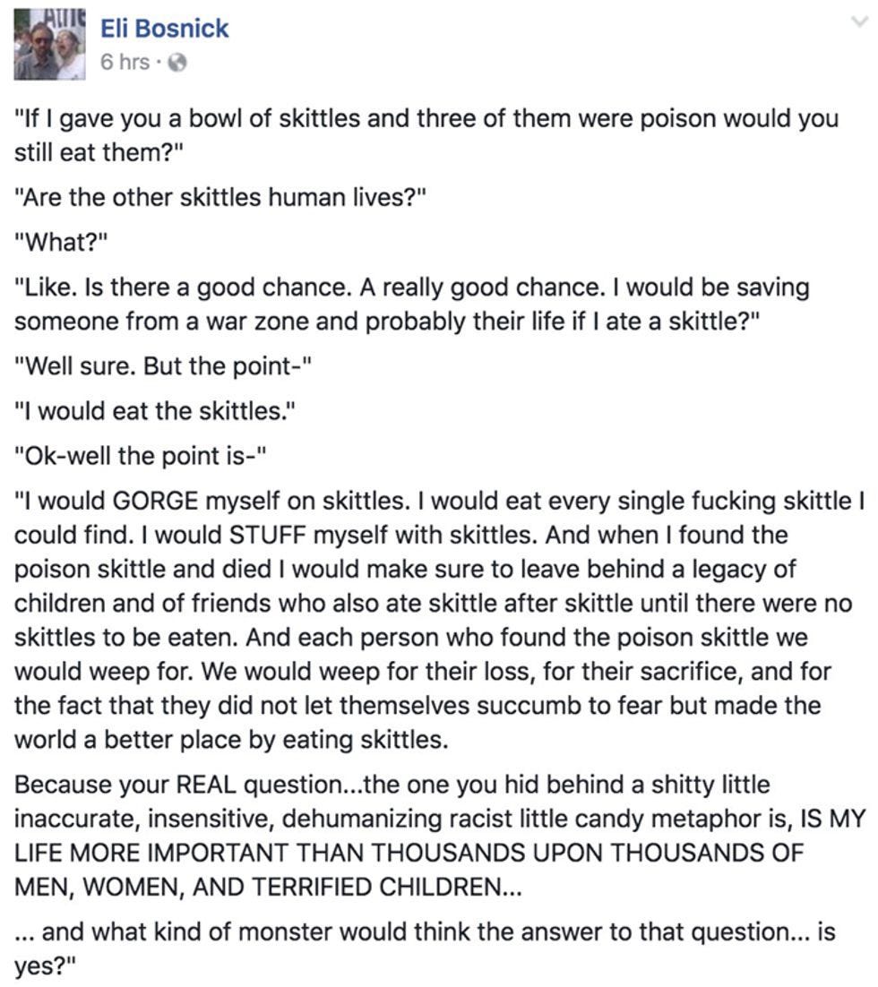 Democracy and humanity and being a decent human being all come with some risks. If you'd like to invoke Anne Frank's "In spite of everything, I still believe people are really good at heart" right now, that's fine with us. It would be a shame to turn this country, a country with terrific people like Karen Green and Alex in New York and Eli Bostick, over to a bunch of fear-filled racist cowards like Donald Trump. We live in a much better America than that.