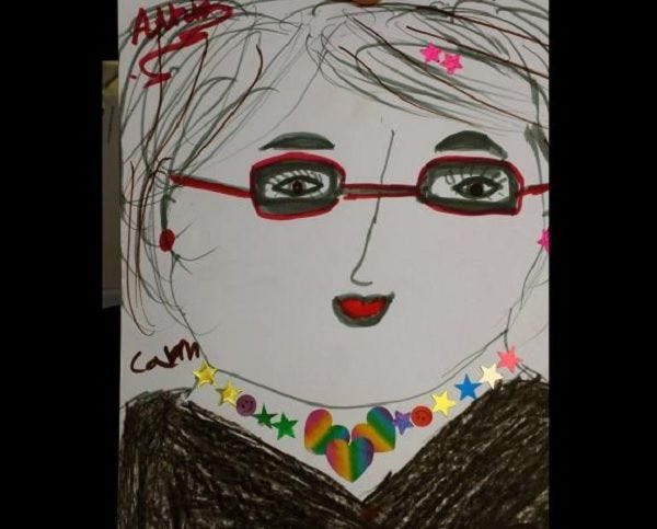 Portrait of volunteer Karen Green by 12-year-old refugee kid. Note: glittery stars could be used as shrapnel in a bomb.