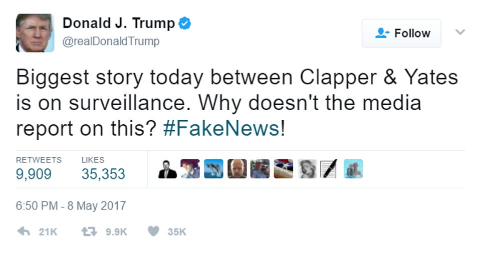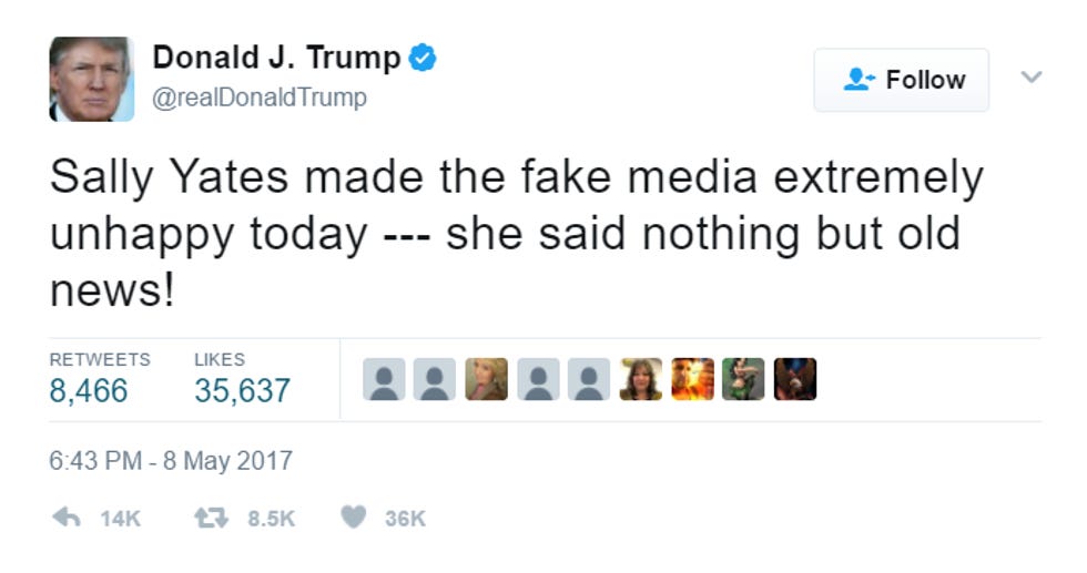 So Monday night, Trump pulled out his Twitter box (like he did before the hearing ) and tried his damnedest to do "fake news" to what everybody saw on TV with their own eyes, to try to convince us all that Donald Trump rules and Sally Yates drools.