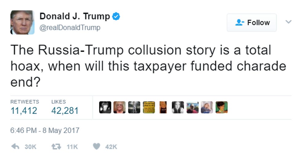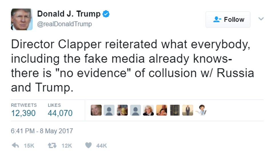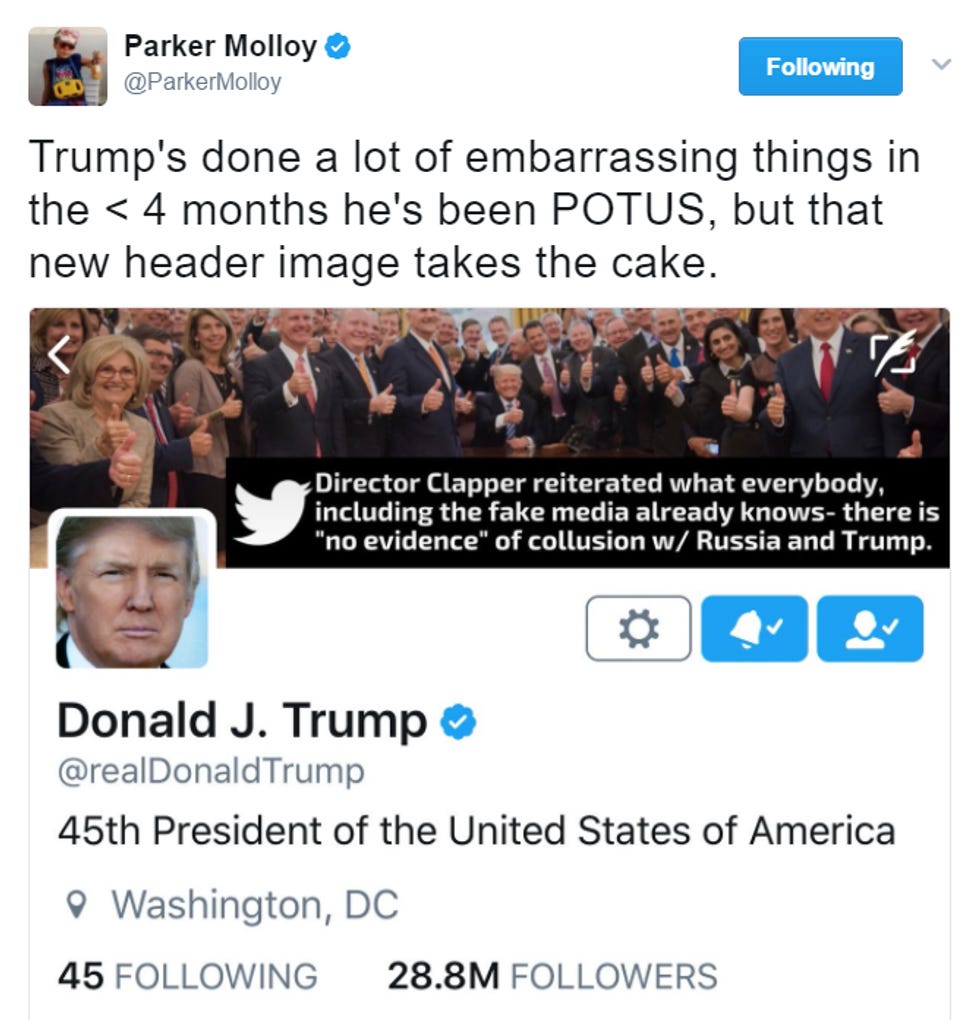 Oh goodness, Trump must have been watching a different hearing from the one we saw. Maybe Kellyanne flipped the TV onto "Judge Judy" when Trump wasn't looking and he's too dumb to know the difference. But Trump was so sure Clapper said there is "no evidence" of mutual masturbation between Trump and Russian intelligence that he excitedly changed his Twitter banner to look like this, albeit briefly: