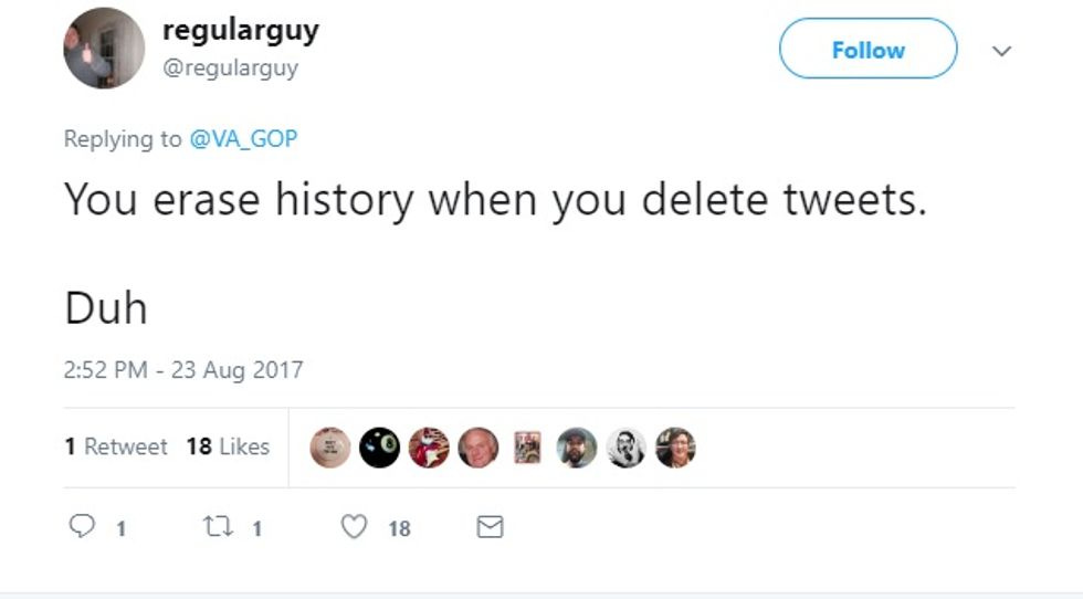 After about four hours, the state party finally realized maybe they weren't getting quite the sort of attention they wanted, and they removed the tweets. Northam, on the other hand, was happy to leave his reply up, what with being on the right side of history and all: