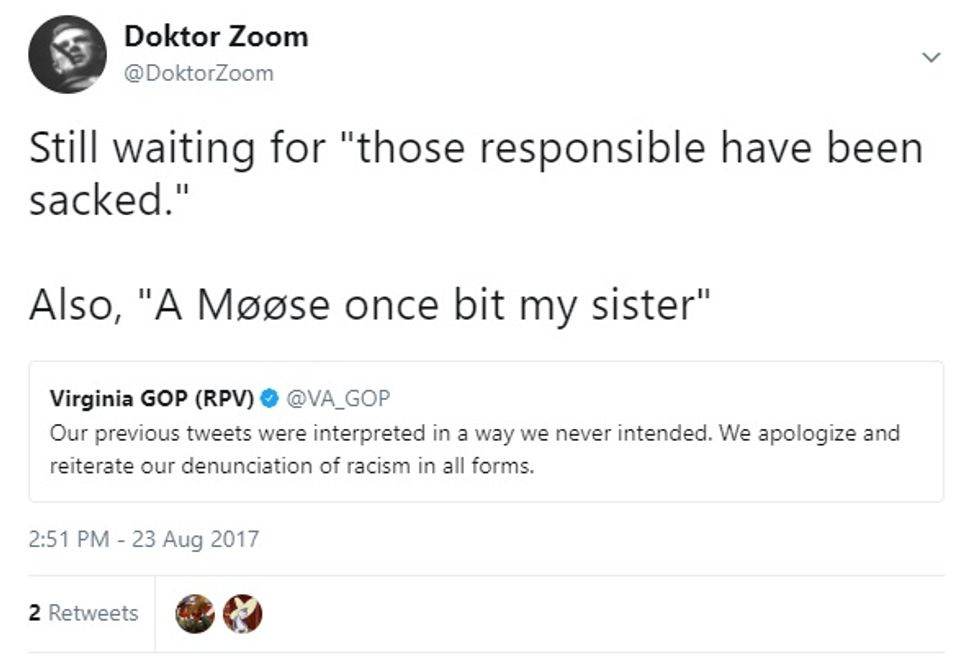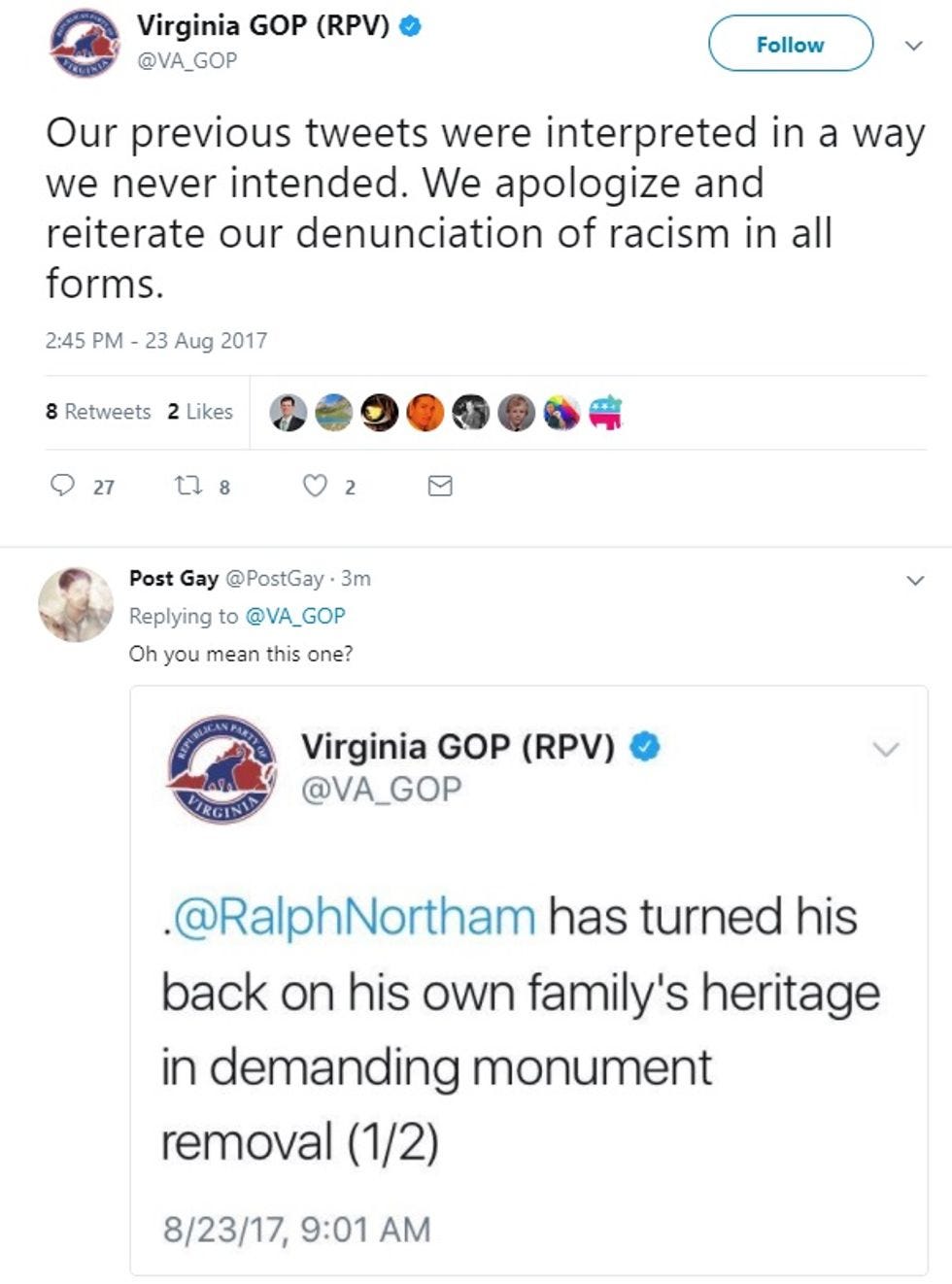 Eventually, the Virginia Republicans posted an apology, since they were simply aghast that anyone would misinterpret their message. Just as they felt compelled to issue a pro-forma apology, we felt compelled to include the top reply: