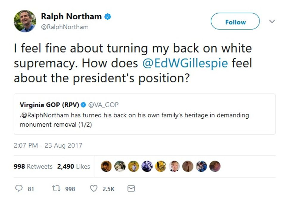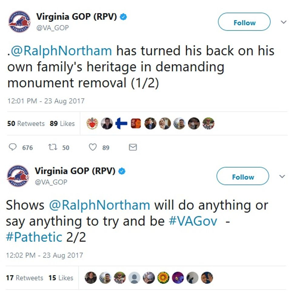 In what has to be the stupidest stretch of logic -- today, at least -- in the ongoing dialogue over the removal of Confederate monuments, the Virginia GOP posted a weirdass condemnation of Democratic Lt. Gov. Ralph Northam, who's now running for governor (Terry McAuliffe is term-limited). You see, Northam has called for the removal of Civil War Participation Trophies, since they honor actual traitors to the USA, and were mostly erected to reinforce the post-Reconstruction myth of the "Lost Cause" -- historically, they have more to do with reinforcing white supremacy than anything else. Ah, but the state GOP thought it had a real winner of a slam on Northam, whose ancestors actually owned slaves: