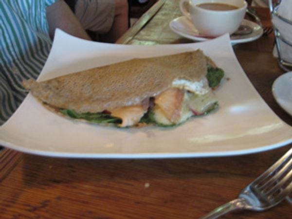 The Parisian fare at Montmartre is generally excellent. In particular, they make a luxurious buckwheat crepe which is best filled with the salmon, cheese, dill and fresh vegetables (there's also a prosciutto-filled option). The salmon is grilled and not overcooked while the vegetables are fresh and crisp. Another highlight is their Croque Monsieur -- a grilled ham and Gruyere sandwich with more cheese melted on top and served over a good dijon mustard. They also offer a quiche of the day, which is generally well-prepared, though not spectacular.