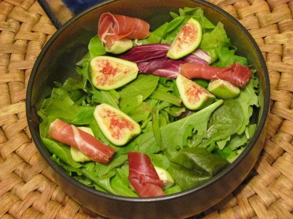 Anyhoo, since Nikola Tavelic was from Croatia, where that fancy Dalmatian fig jam comes from, we'll eat some figs in his honor. Figs are very expensive to buy, so we suggest foraging for them. This will be the last batch we can get this year, but remember this recipe late next summer when you see figs on the trees in your neighborhood or at your farmers market. "The Flavor Bible" (which would be a great War on Christmas gift for the foodie in your life) tells us that fresh figs go well with prosciutto and salad greens, so here we go: