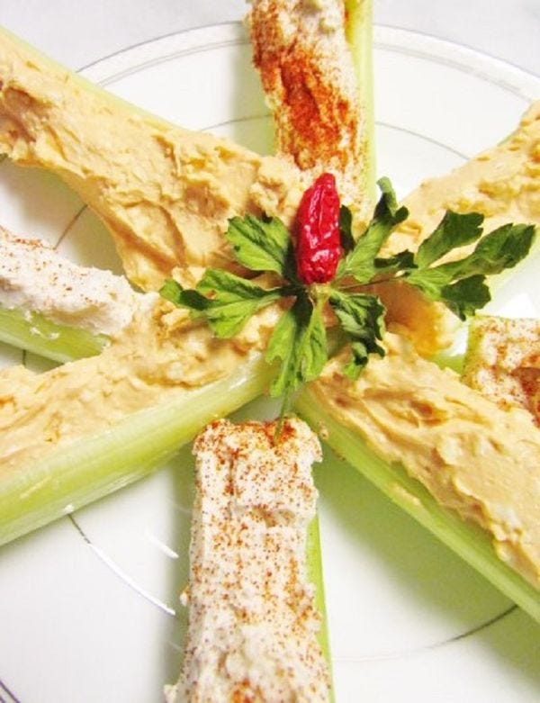 Here's an American-style vegetable dish for your Thanksgiving pre-feast noshing. It's celery! Stuffed with cream cheese * , mostly.