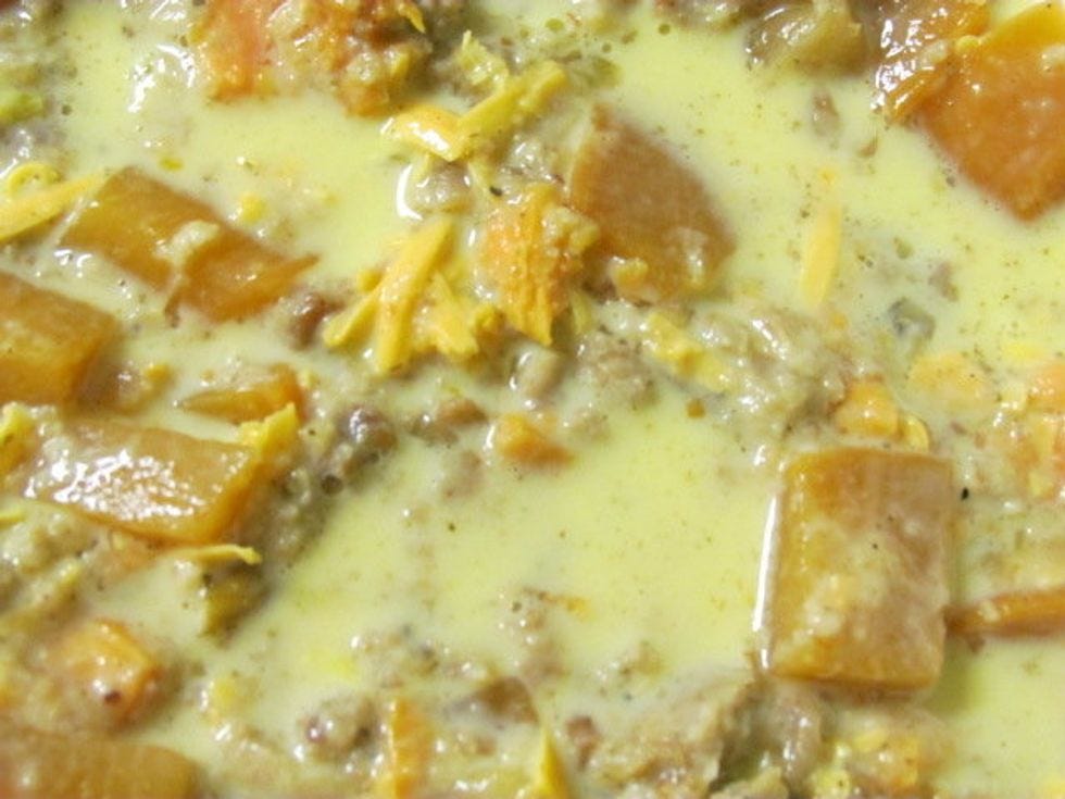 Put the stuffing in the casserole in big chunks. Mix in the "plus a little more" of cheese.