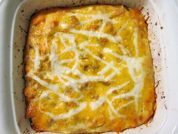 This one doesn't have any meat, but you may include leftover turkey or any kind of breakfast meat you like (and maybe your leftover stuffing has some kind of meat in it). If you had a ham on Thanksgiving, throw in a handful of ham cubes. If you want sausage or bacon in it, cook them first in a skillet and drain the fat.