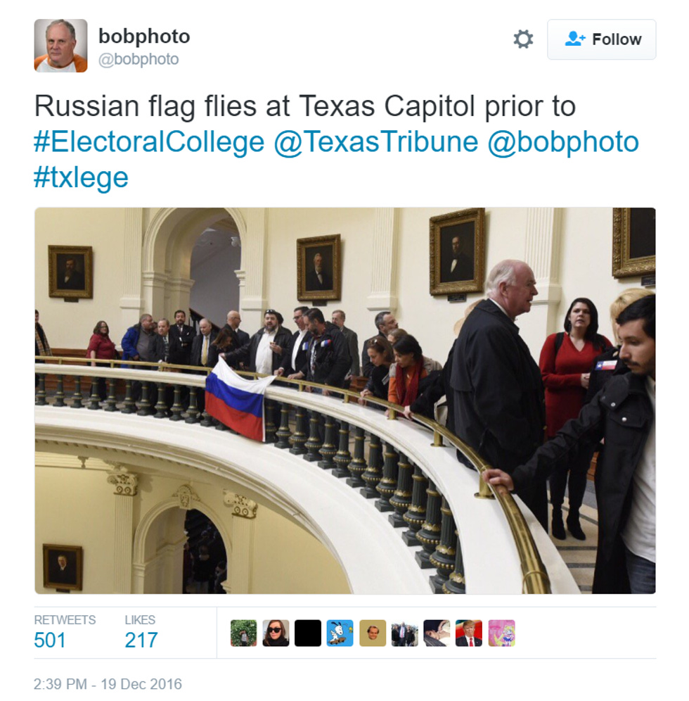 Now you'd think it was the pro-Trump Texan electors who unfurled the Russian flag, since they love Russia more than they love their own country, but it was, in fact, anti-Trump protesters who did that, to make a point about what the electors were about to do: