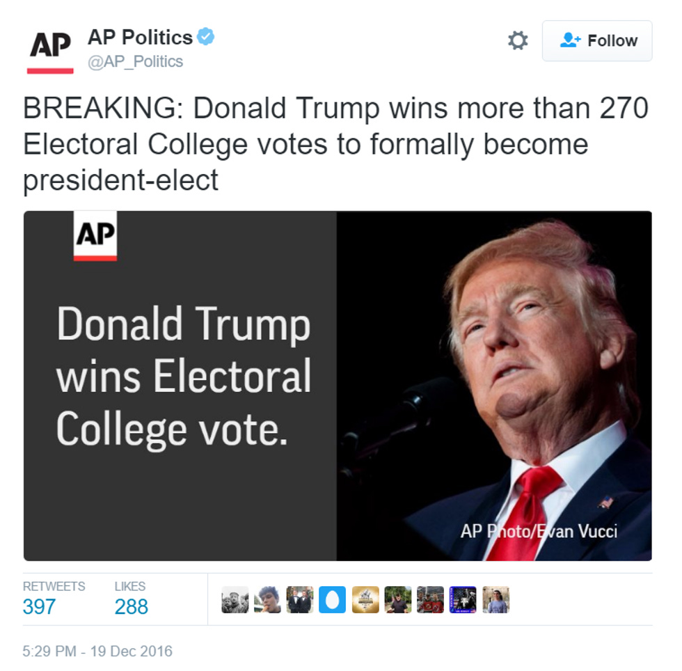 Texas put the Republican president-elect over the 270-vote threshold. Electors had been deluged with emails, phone calls and letters urging them not to support Trump. Two Texas electors cast protest votes against Trump, but in the end he had more than he needed.