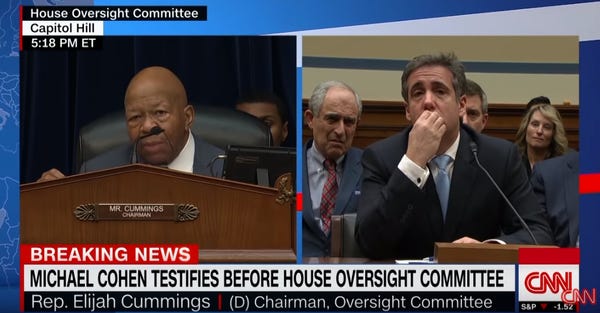 Cummings concluded by yelling directly at his Republican counterparts for being a buncha fuckin' liars when they constantly claimed yesterday was the committee's FIRST hearing -- as if they haven't been doing hard and necessary work ever since the moment they were seated -- and then adjourned the hearing. It was a very good talk he had just had with Michael Cohen, and with America.