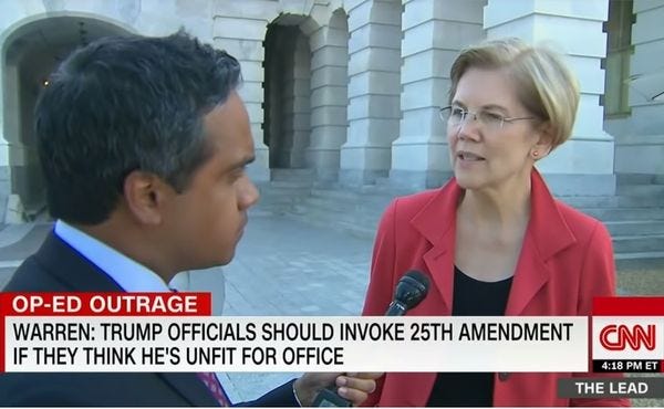 Still, Warren continued with her inflammatory trolling, which had less to do with actually getting the 25th Amendment ball rolling than with calling out Republicans who love all the fuckery Trump's up to, but wish it could be done with less unseemly goosestepping: