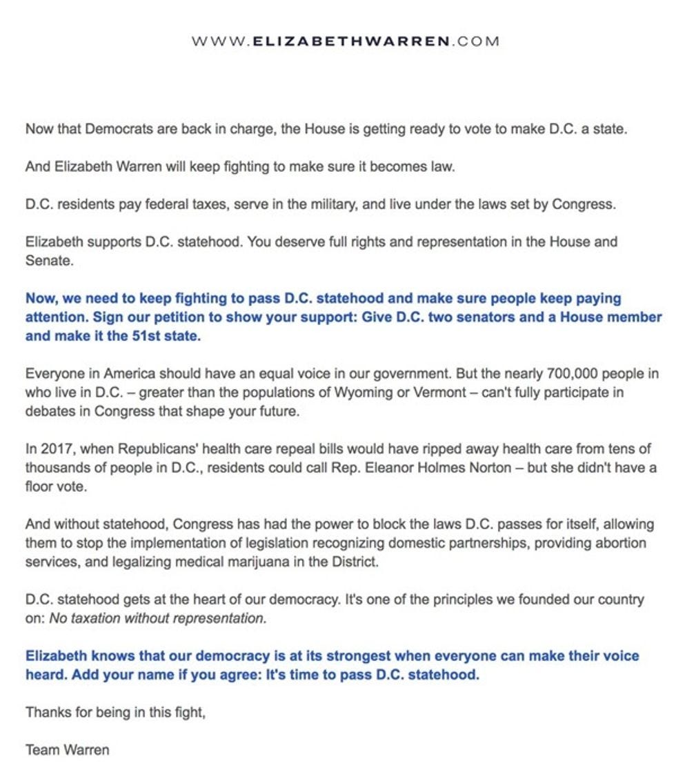 Seizing on an issue that Barack Obama never really pushed (to the disappointment of a lot of DC residents), Warren's campaign framed the letter as a direct appeal to residents of the district, although NBC politics reporter Alex Seitz-Wald says the message went out to Warren's full national mailing list. Here's the full text: