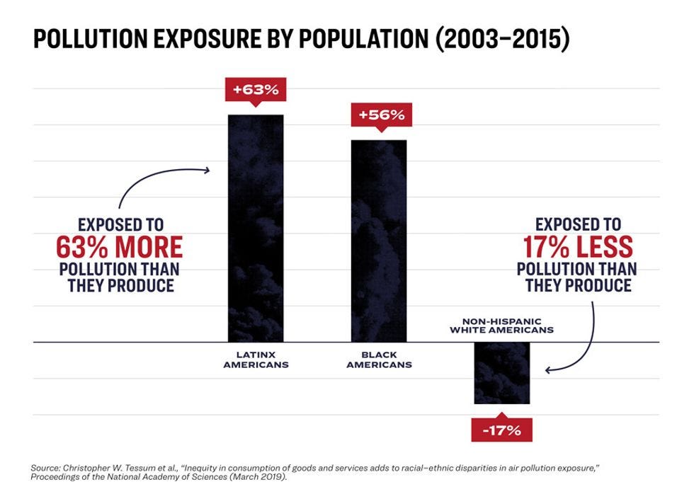 From predominantly black neighborhoods in Detroit to Navajo communities in the southwest to Louisiana's Cancer Alley , industrial pollution has been concentrated in low-income communities for decades - communities that the federal government has tacitly written off as so-called " sacrifice zones ." But it's not just about poverty, it's also about race. A seminal study found that black families are more likely to live in neighborhoods with higher concentrations of air pollution than white families - even when they have the same or more income. A more recent study found that while whites largely cause air pollution, Blacks and Latinxs are more likely to breathe it in . Unsurprisingly, these groups also experience higher rates of childhood asthma .