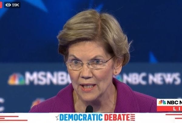 Bloomberg wasn't the only recipient of Warren's tender mercies. When Pete Buttigieg suggested Amy Klobuchar was a big dummy for having a brainfart on the name of the Mexican president, Warren stood up for Klobuchar, pointing out that everyone has brainfarts but there's no question that Klobuchar knows her stuff (unlike some other people in the Oval Office whose brains are all farts, all the time). But then she pivoted right back around and said neither of them had a real healthcare plan: Buttigieg's isn't "a plan; it's a PowerPoint" and Klobuchar's is "like a Post-it note: 'Insert plan here.'" She even went after Bernie Sanders's approach to Medicare for All, calling it