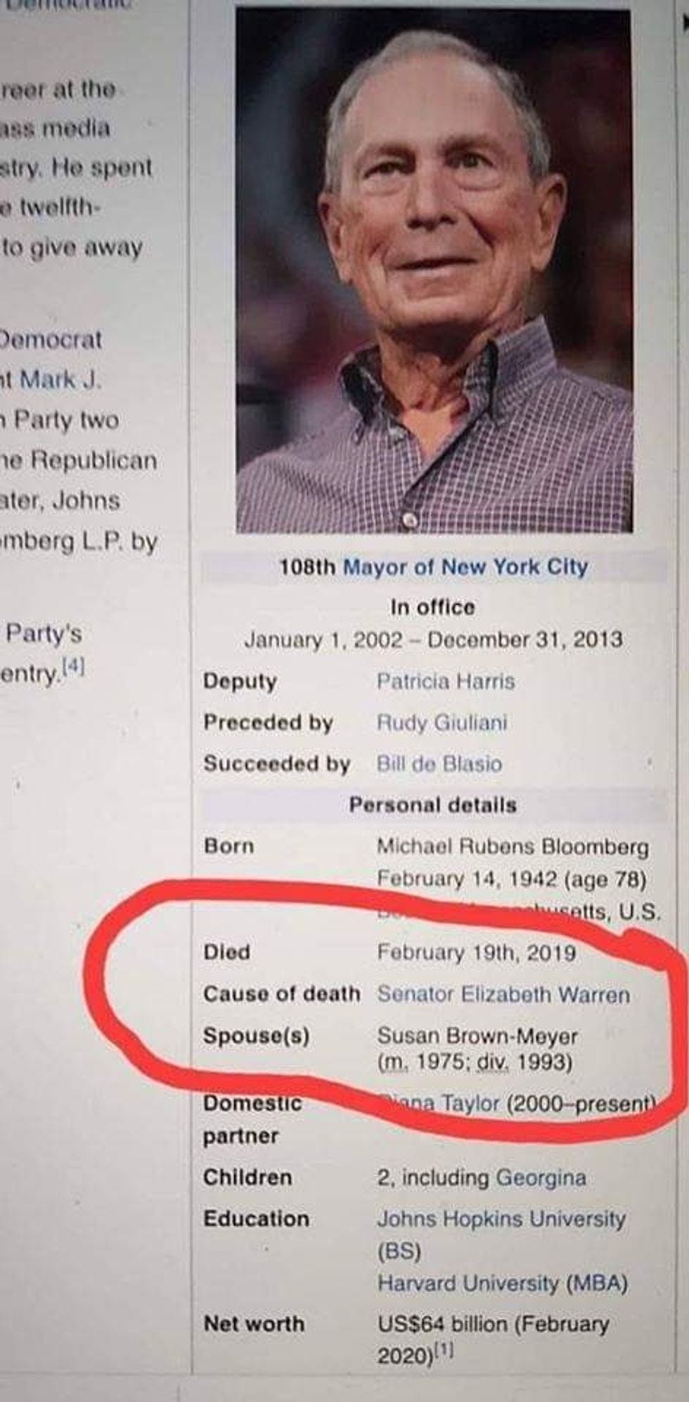 That Bloomberg Wiki page edit though, she killed him so hard he was thrown back 1 year in time and died.