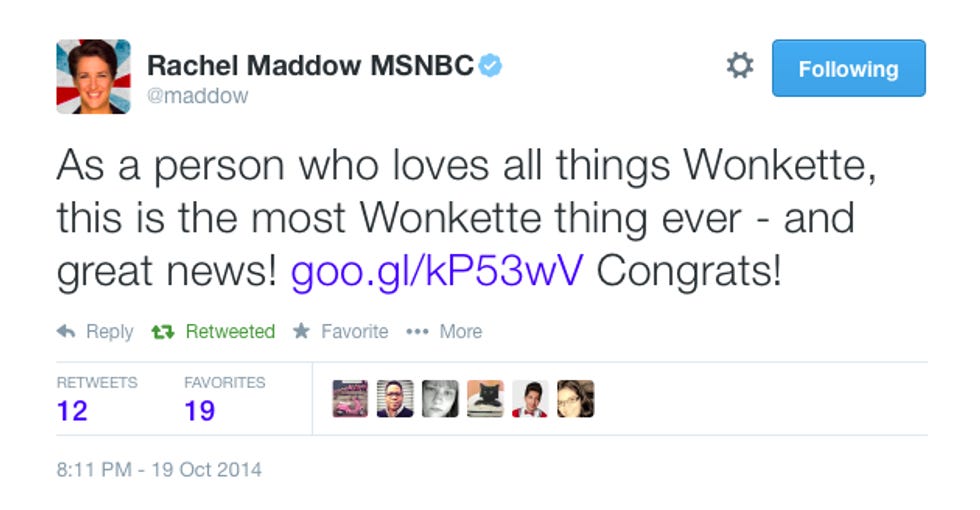 In case you missed it, Yr Editrix figured out how babby is formed . The entire interwebs is very happy about this exciting news, including o ur favorite nerdgirl Rachel Maddow, who loves us back, obviously:
